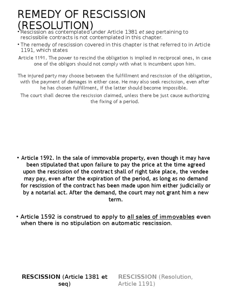 1381 of the New Civil Code. Contract rescission is also a remedy in cases where there was an issue with forming a contract. Rescission referred to in this Article is RESOLUTION or cancellation of the contract which is.