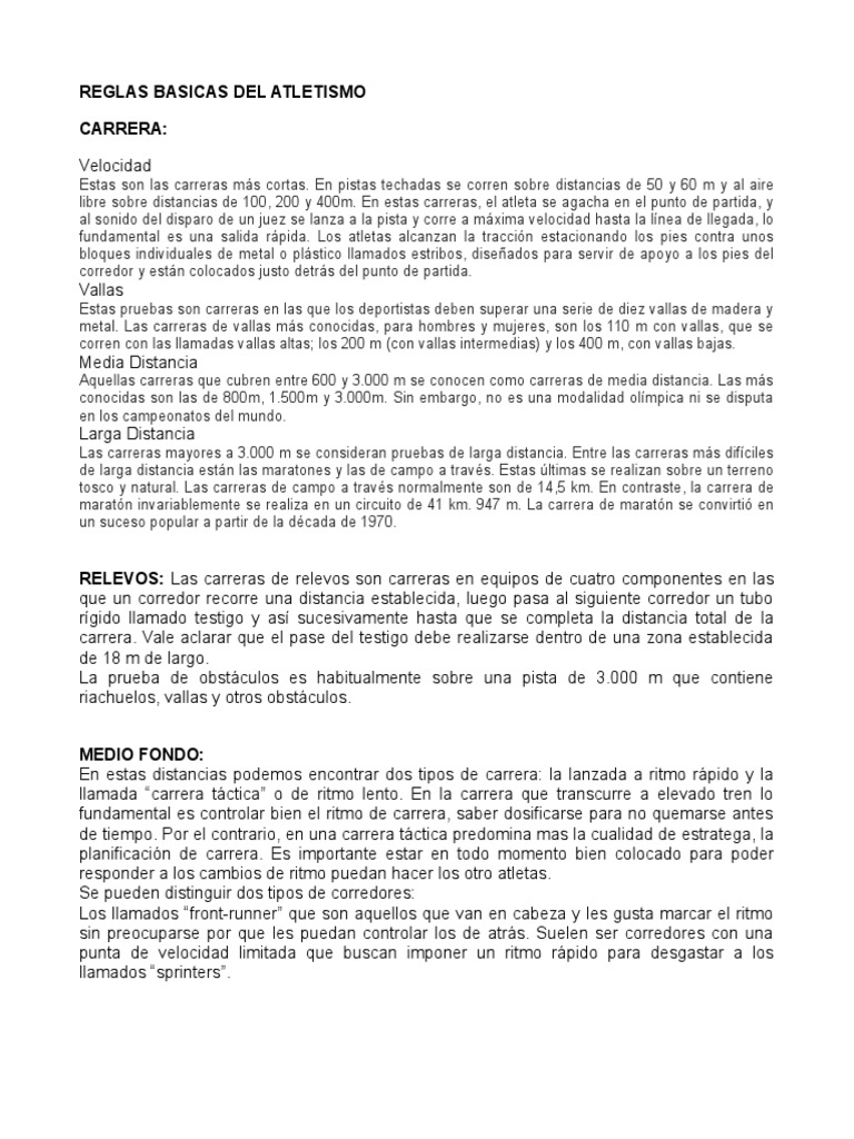 En definitiva sería un brinco un paso un salto vuelo y finalmente caída. Las competencias de velocidad se realizan en una pista estándar con 6 a 8 carriles de 400 metros de longitud tendrá dos rectas paralelas y dos curvas cuyos radios serán iguales el.